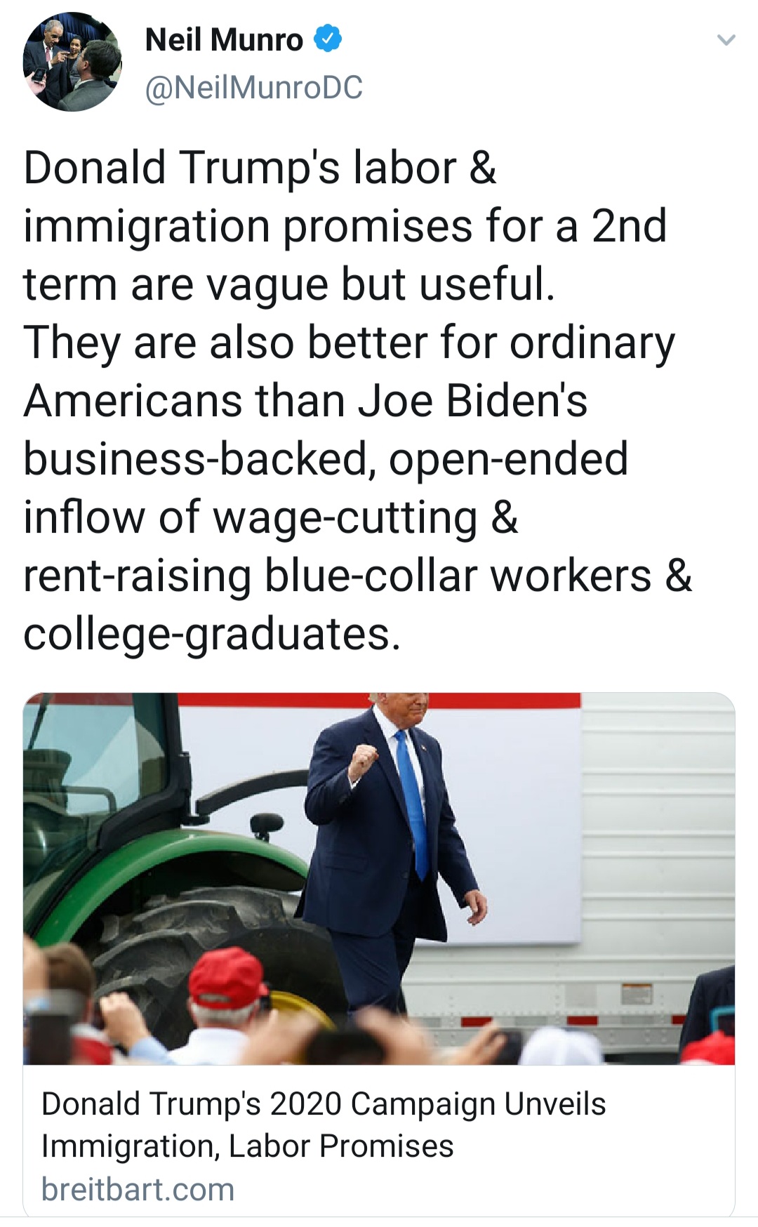 But the campaign document shows that Trump and his deputies know that opposition to cheap-labor migration is a vote-winner, said Vaughan. “It is an acknowledgment that this a major problem — and one that would be made worse under a Biden administration,” she said. “That is something Republicans rarely understand until Trump — that bold moves to protect the interests of American workers would get people elected.”