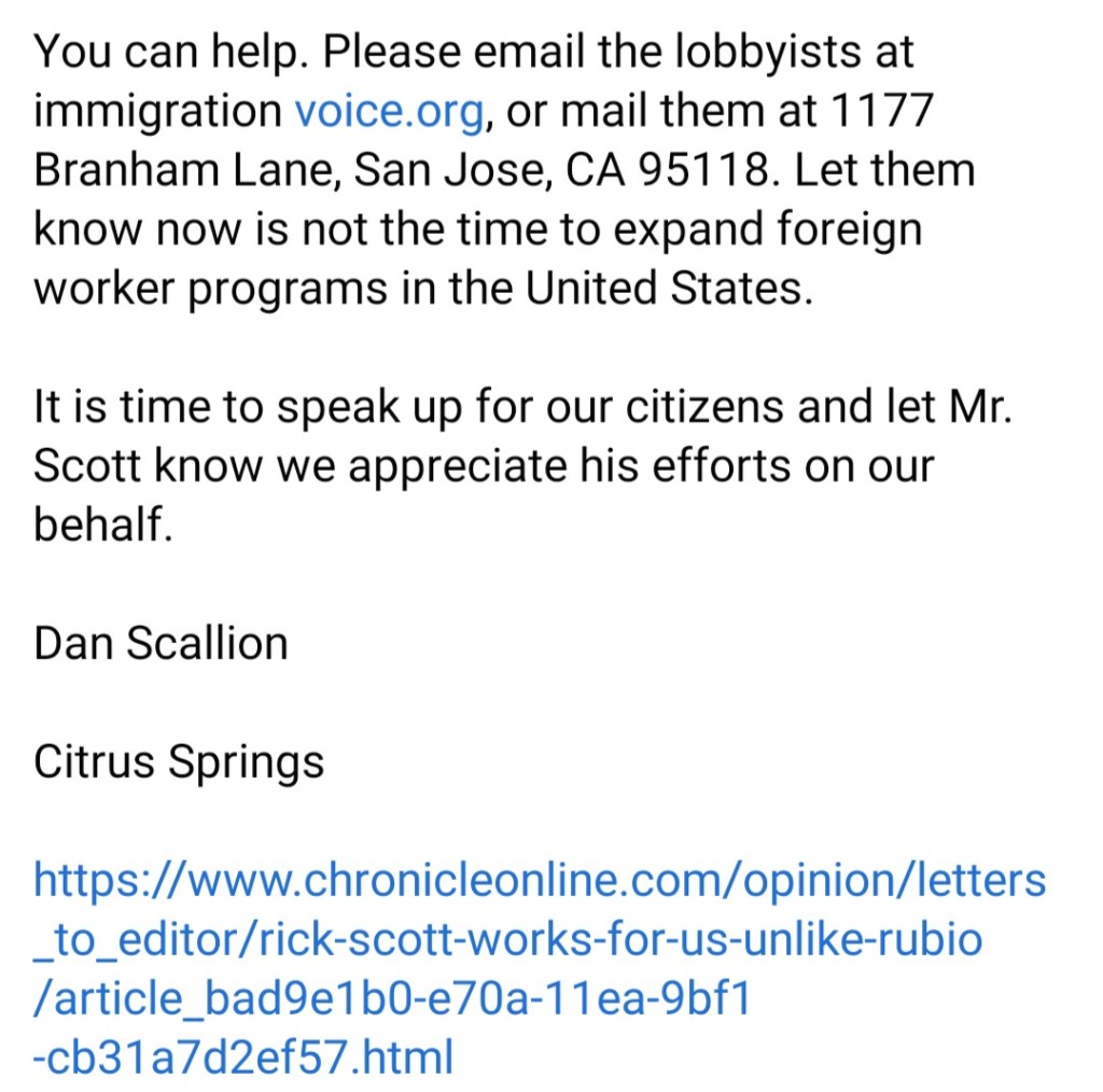 “Recently U.S. Sen. Rick Scott stepped up and objected to Sen. Mike Lee’s attempt to restart green cards for foreign workers, even while Americans are experiencing record unemployment. Lee tried to sneak the package through using unanimous consent, meaning if no one objected it passed. Mr. Scott objected, and we owe him our thanks for trying to help citizens to return to the workforce, when it is apparent Sen. Marco Rubio and others couldn’t care less.