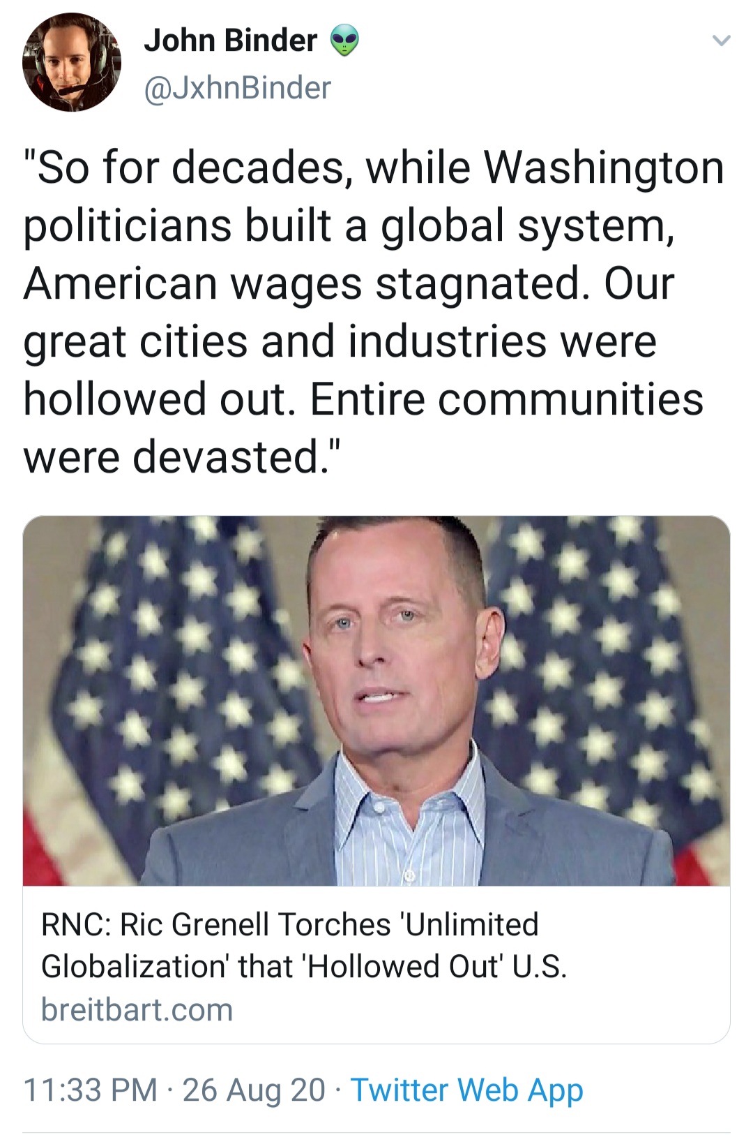 “Richard Grenell, the former Acting Director of National Intelligence and former United States Ambassador to Germany, torched “unlimited globalization” and it’s devastating impact on America’s working and middle class during his speech at the Republican National Convention (RNC).