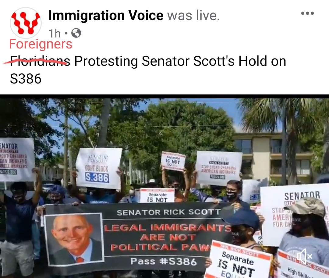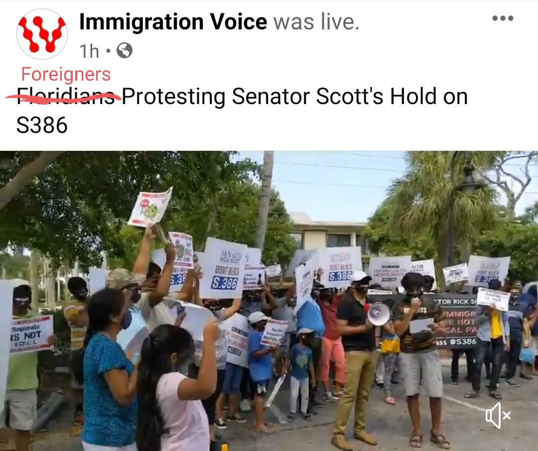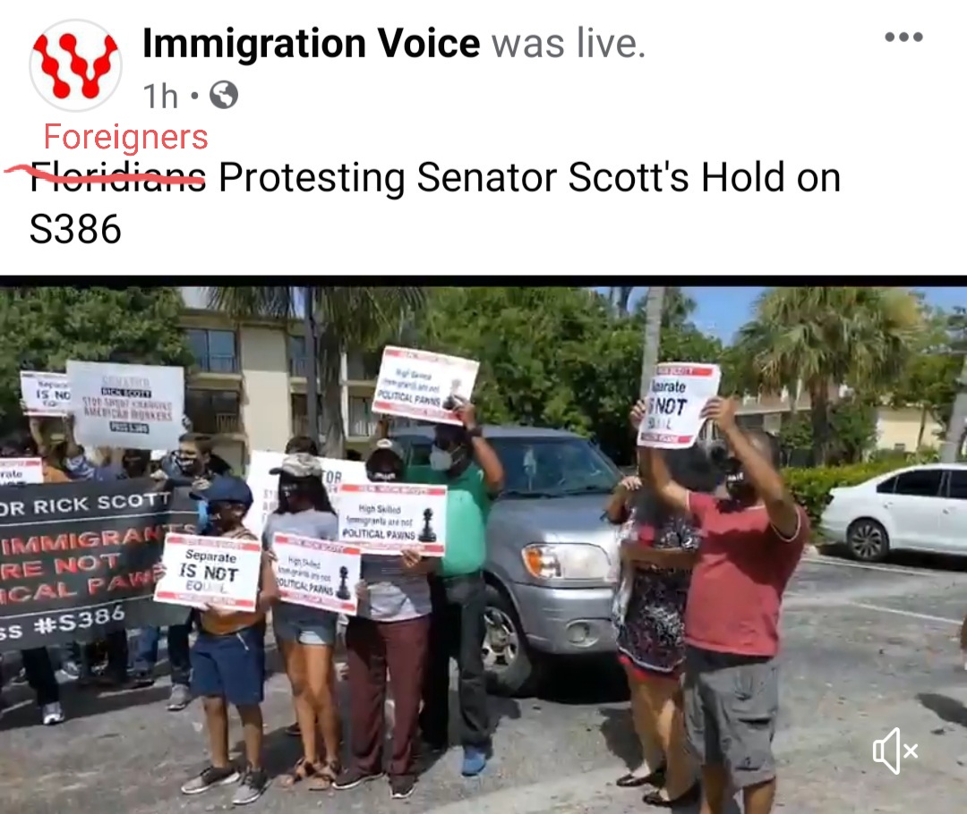 Correction! Immigration Voice has it wrong! Floridians are Siding with our American White-Collar Workers and Senator Rick Scott! These are FOREIGNERS, specifically H-1Bs and H4EADs from India, who are protesting in Florida with their kids!