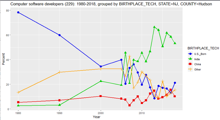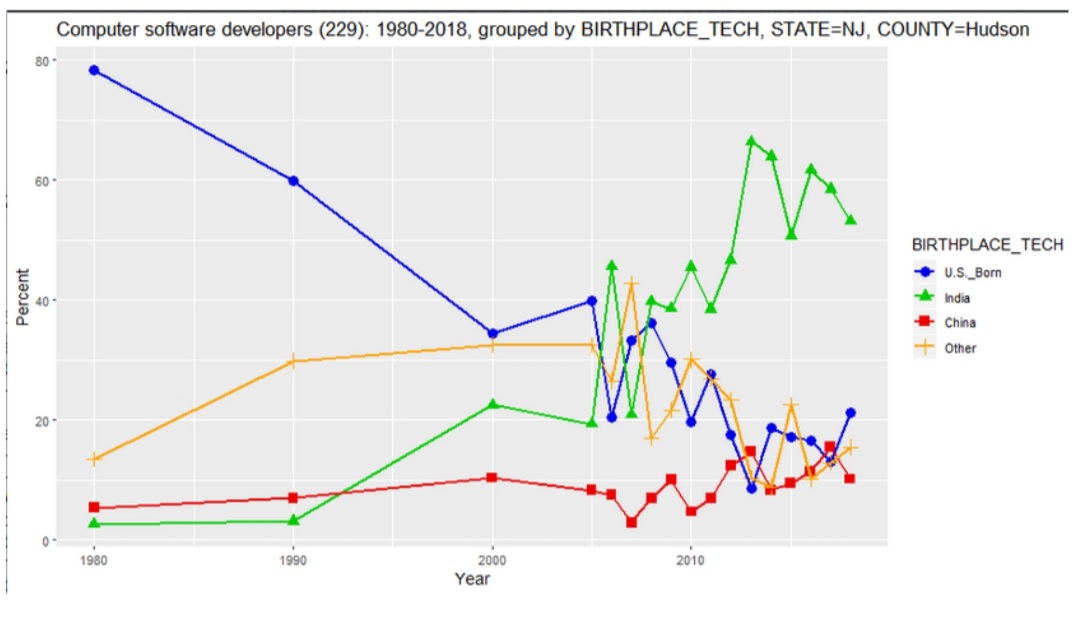 From Birthplaces of Software Developers in U.S. through 2018, we see 9 NJ counties (Middlesex, Hudson, Mercer, Somerset, Passaic, Bergen, Essex, Morris, Camden) were among the top 50 American counties with the Lowest Percentage of U.S. Born Computer Software Developers, 1000 or more workers, in 2018. As can be seen below, in Hudson County American born Software Developers (including Blacks and Hispanics) are a minority, while India born Software Developers are a majority.