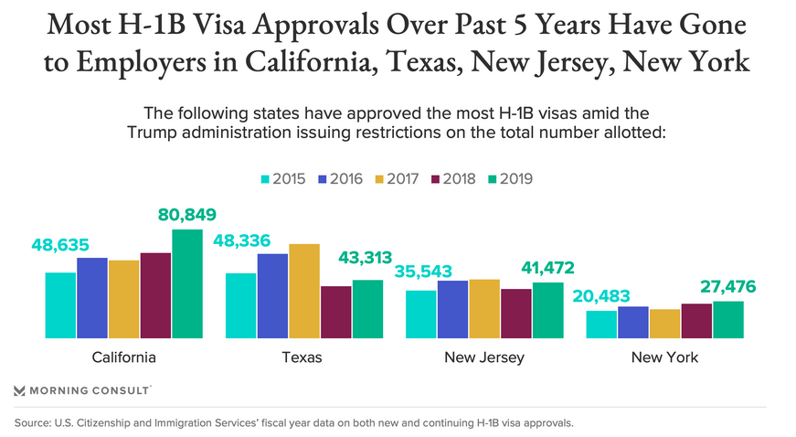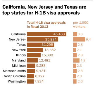 Key facts about the U.S. H-1B visa program and California, Texas and New Jersey Employers Have the Most to Lose From H-1B Restrictions (but doesn’t mention employees have the most to gain) both show New Jersey has a high number of approved H1B visa workers, especially when one considers New Jersey’s size and population. In 2013, New Jersey had the highest concentration of H1B visa workers of the top 10 states for H1B. And since New Jersey is basically a sanctuary state for unlawful immigrants, the number may be much higher when including those with expired H1B or F-1 visas.