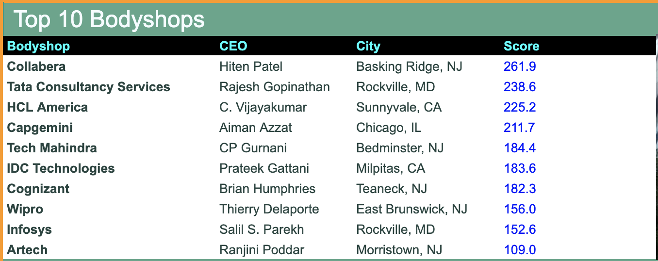 So who is the worst bodyshop in America? According to our scoring system, it’s Collabera.