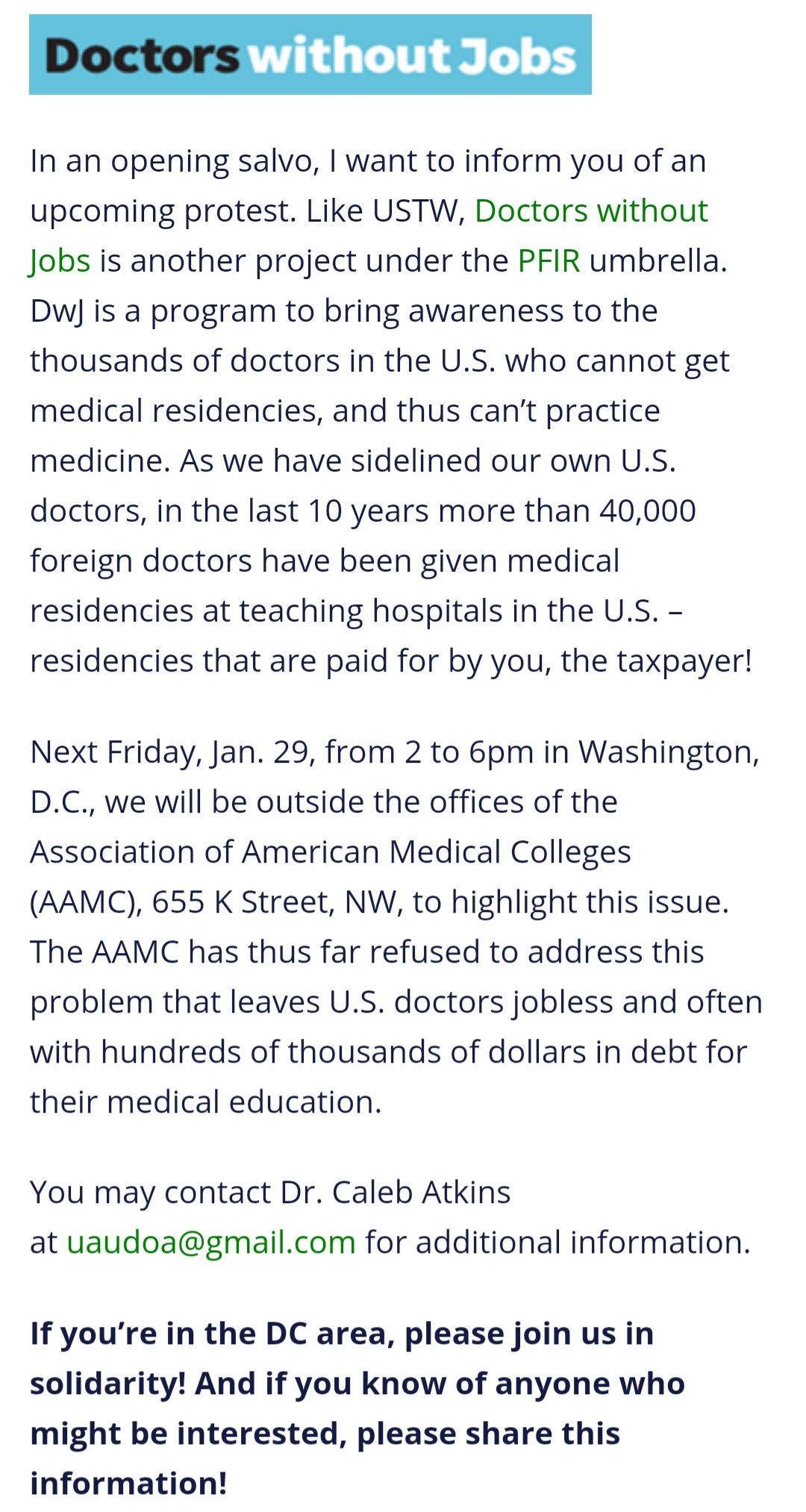American medical school graduates, their Parents and Friends are asking President Biden, USCIS, US Senators and Representatives to halt the H-1B and J-1 visa programs that import thousands of foreign doctors every year — taking jobs from qualified Americans who are unmatched for residencies.