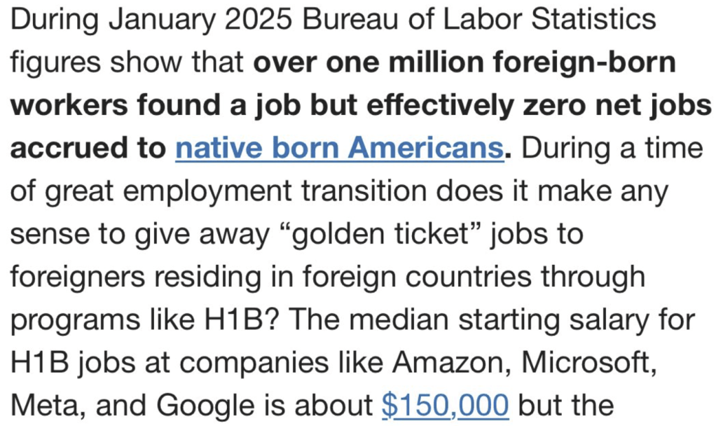 Trump has the power to act. Day one, he should sign an executive order ending H-1B, L1, J1, OPT, and H4EAD visas—no exceptions, no delays. Send those jobs back to Americans, and let corporations figure out how to hire locally for a change. Then, get to work on creating new industries—manufacturing, infrastructure, energy—that can employ millions more. We’re behind you, Mr. President, but the clock is ticking.