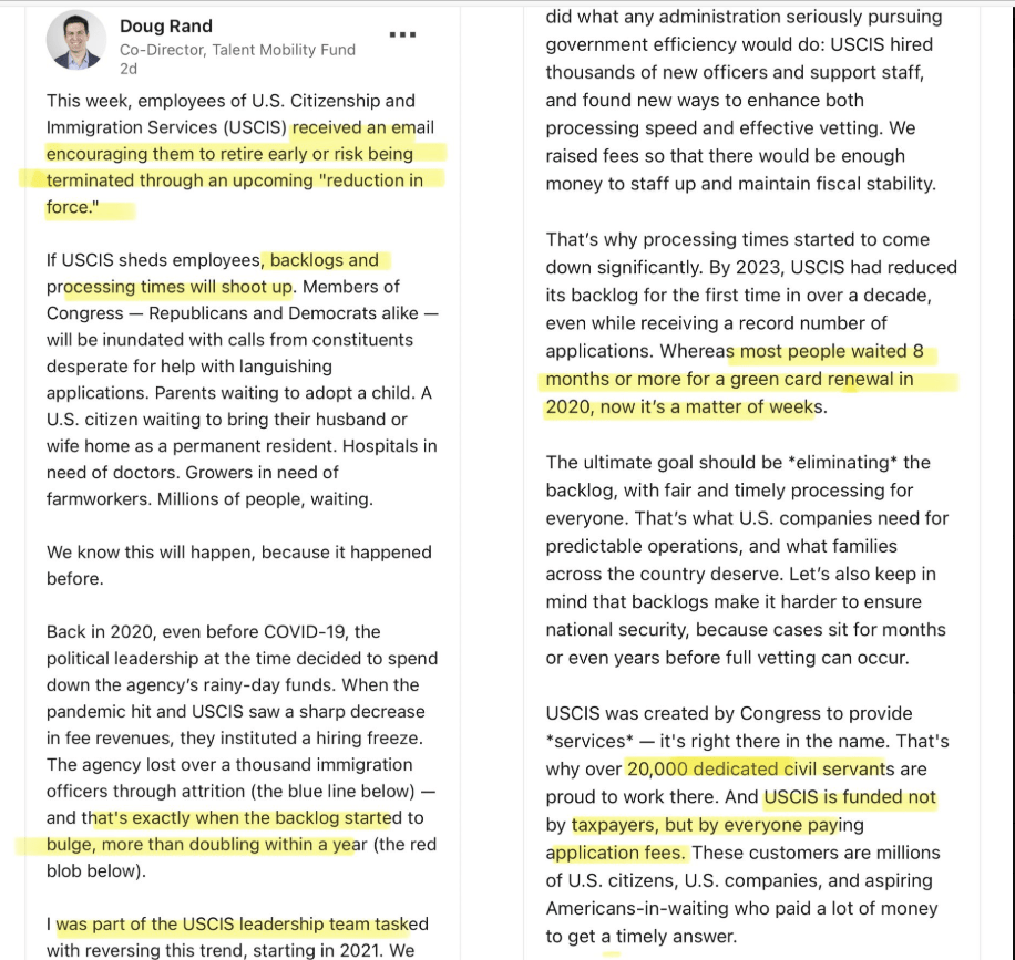 The USCIS, which processes immigration applications including H-1B visas, is facing a massive staff reduction that could slash its workforce by thousands. Citing former USCIS leadership team member @doug_rand, the post warns of dire consequences: backlogs doubled during a similar cut in 2020, and this time, processing times will rise, families will be separated, and businesses will suffer.