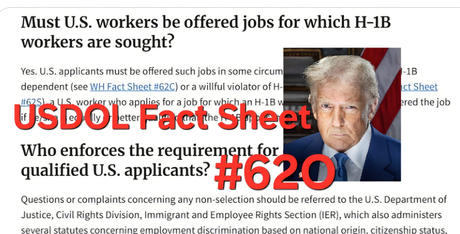Fact Sheet #62O, updated in January 2025, marks an effort to address the displacement of American workers by the H-1B visa program. The policy requires H-1B-dependent employers—those with 15% or more of their workforce on H-1B visas, typically firms with over 50 employees—and willful violators of H-1B regulations to offer jobs to U.S. workers if they are equally or better qualified than H-1B applicants. This reversed the 2023 version, which allowed such employers to bypass Americans, often prioritizing cheaper foreign labor.