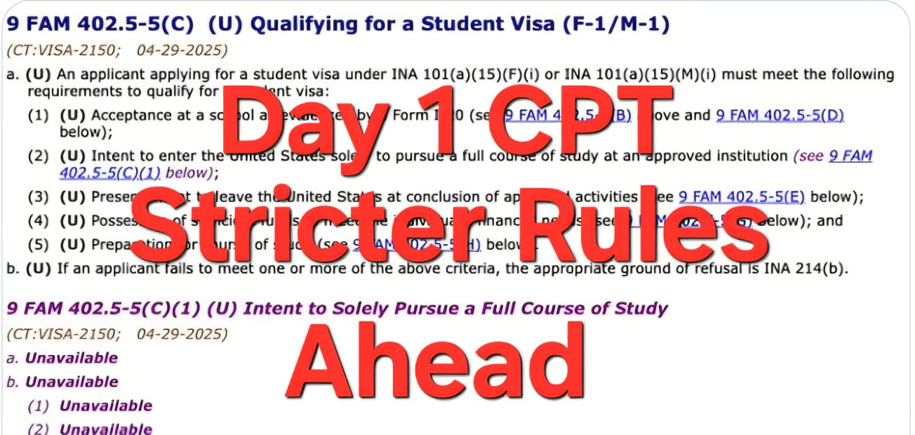 The Foreign Affairs Manual (FAM) is the U.S. Department of State’s guide for visa processing, and the new 9 FAM 402.5-5(C)(1), effective April 29, 2025, is a recent update to student visa policies. Introduced less than two months ago, this rule requires F-1 (academic) and M-1 (vocational) visa applicants to prove their “intent to solely pursue a full course of study,” meaning their primary purpose must be full-time education at an accredited institution, not employment. This targets abuses like Day 1 CPT and OPT, where students work instead of study. The criteria defining this intent are redacted as “Unavailable.” It likely involves stricter interviews and social media vetting, which could reject bid number of applications. For American workers, this could reduce job competition from 150,000 Day 1 CPT and 200,000 OPT participants, potentially restoring 320,000 jobs (BLS labor gap).